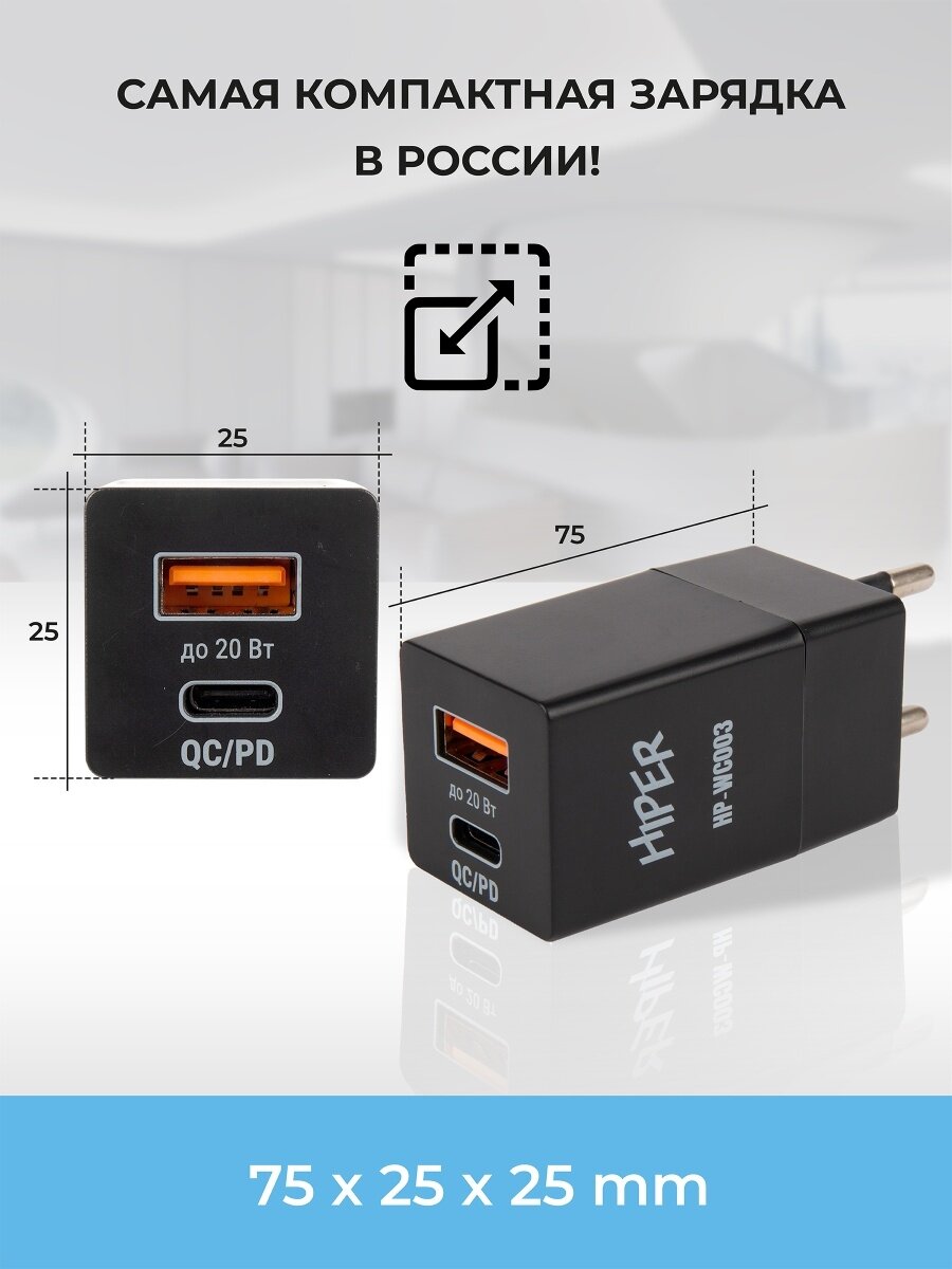 Сетевое зарядное устройство (адаптер питания) HIPER HP-WC003, до 20Вт, USB, USB Type-C, Черный HP-WC003 информация: