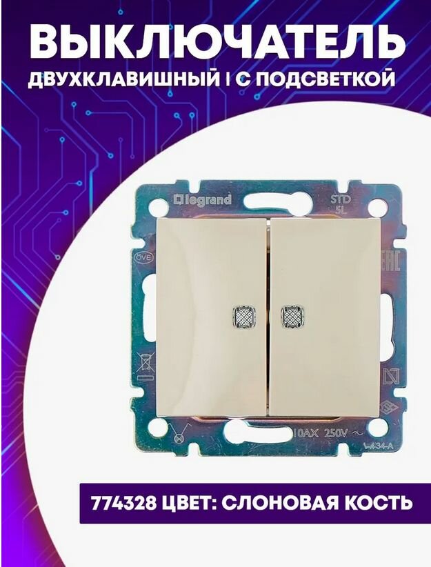 Двухклавишный выключатель Legrand Valena с подсветкой (Слоновая кость) 774328 1 шт информация: