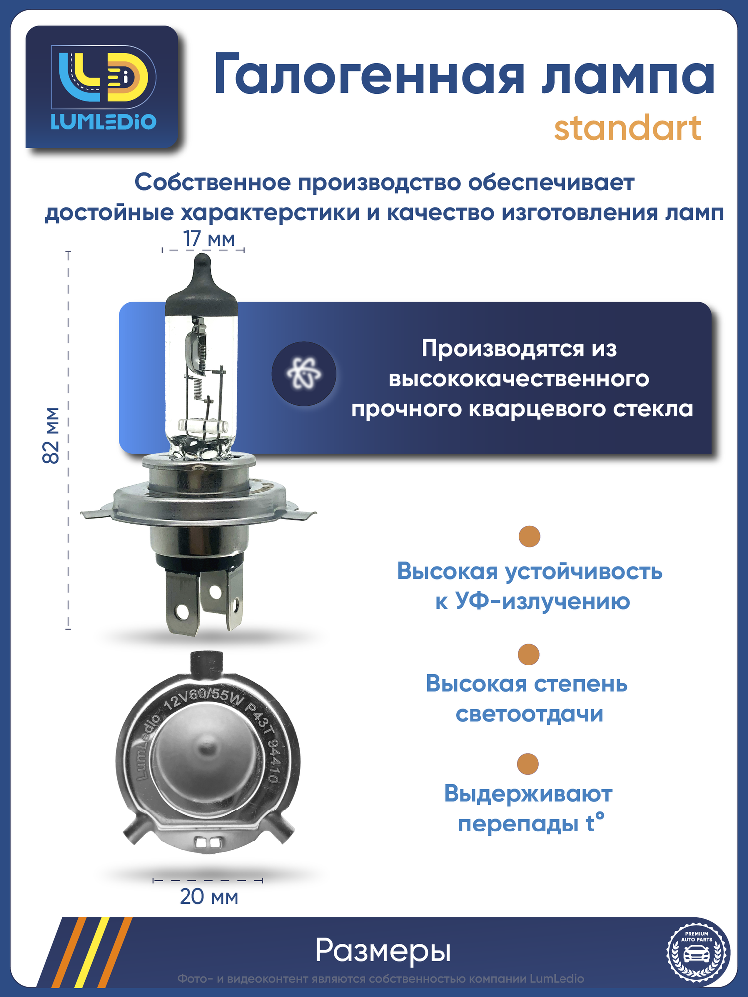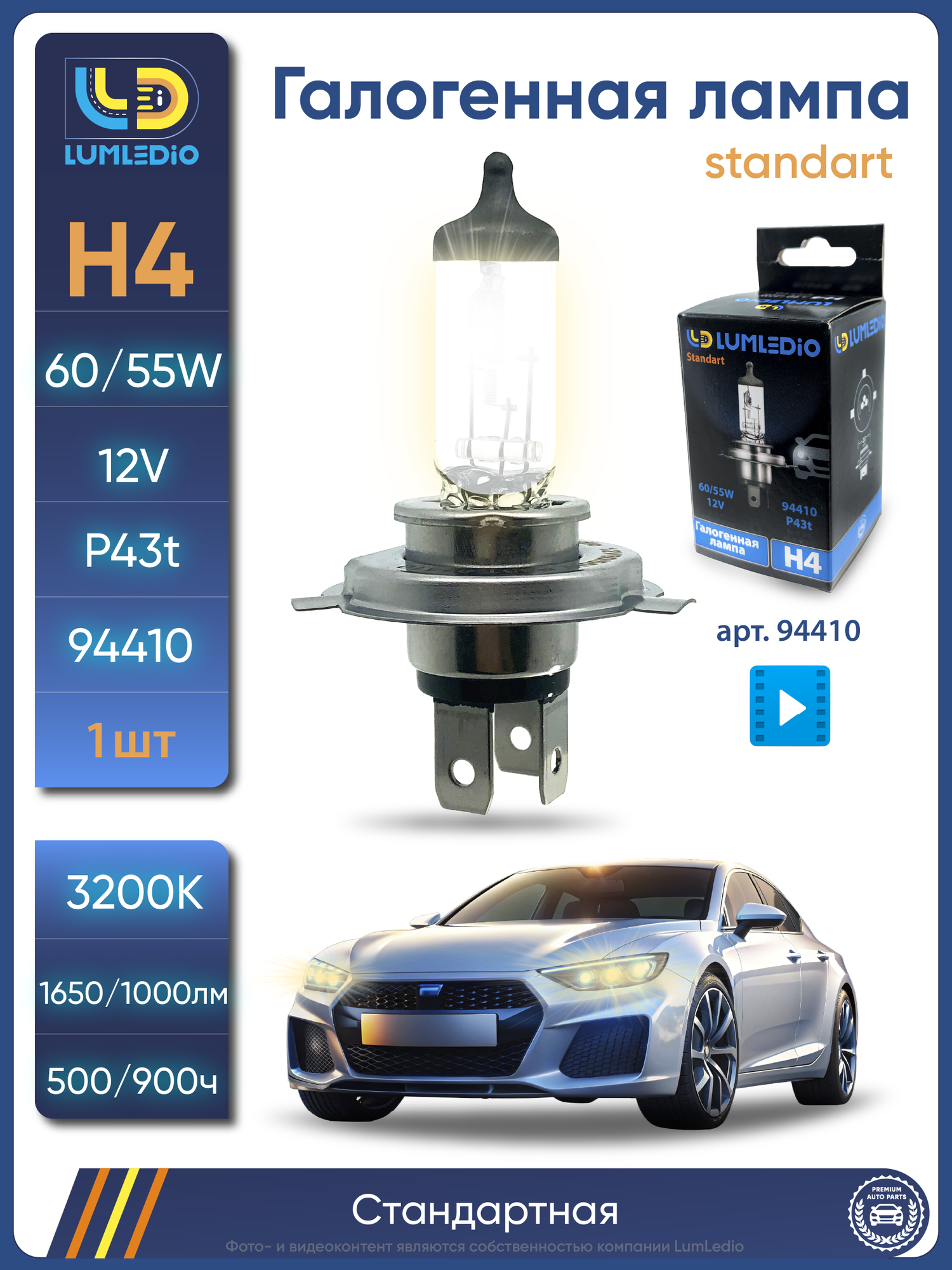 Лампа автомобильная LumLedio H4, 12В 60/55 Вт, 1шт информация: