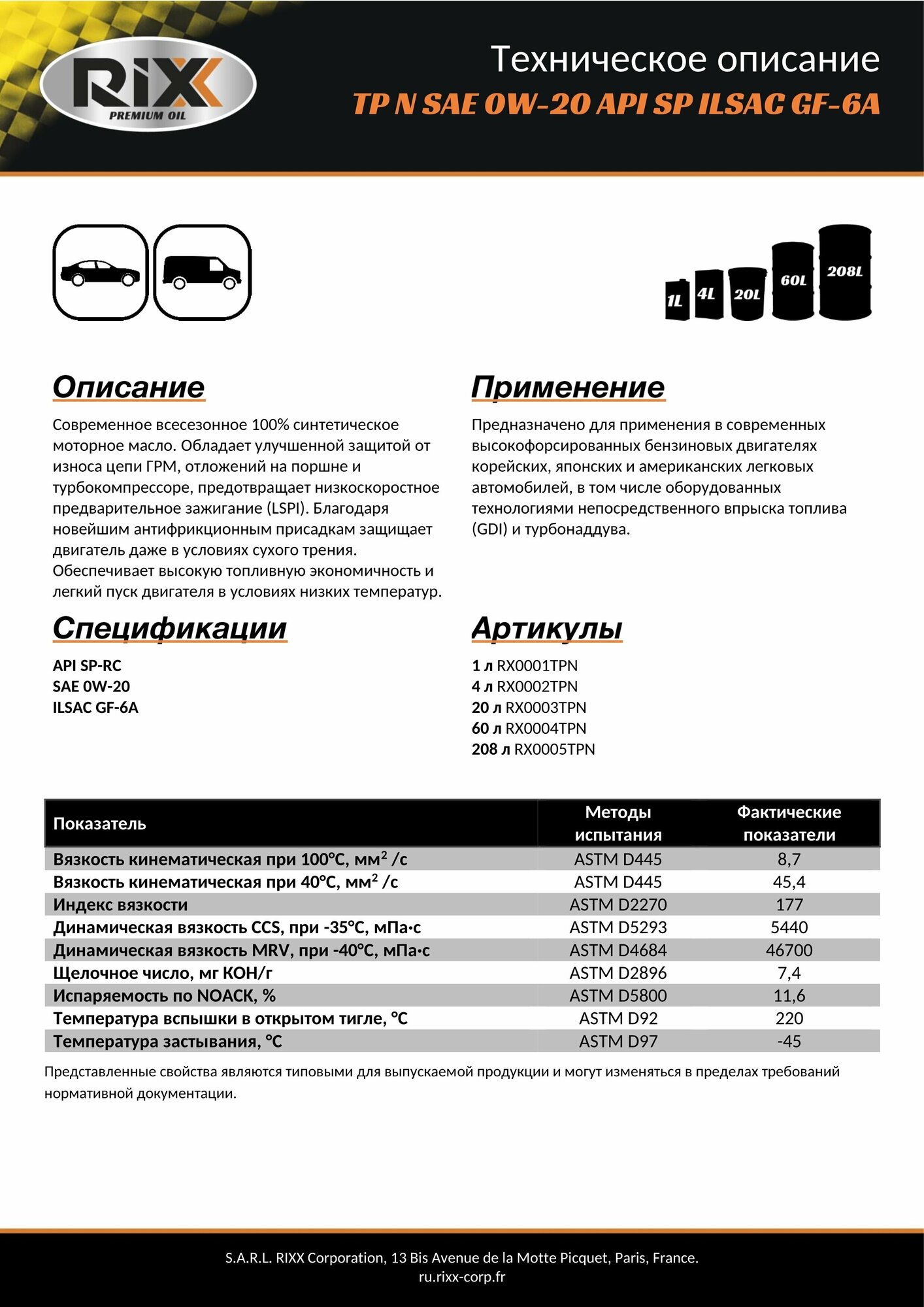 Масло моторное синтетическое RIXX TP N 5W-30 SP/ILSAC GF-6AF РАО 4л информация: