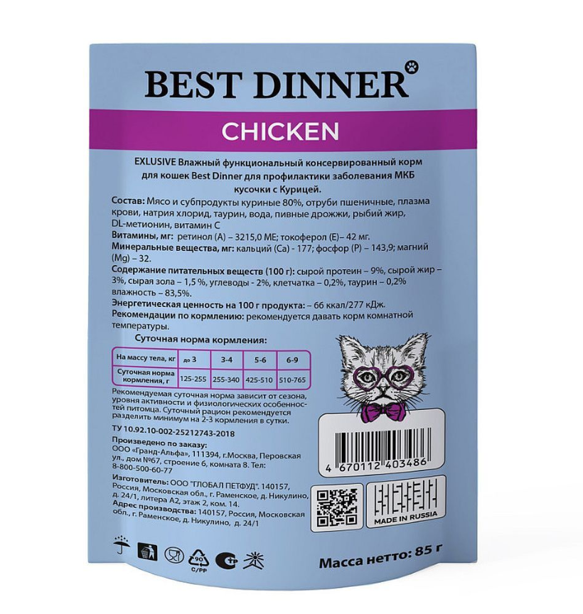 Корм для кошек Best Dinner Exclusive для профилактики МКБ, с курицей, с телятиной и с клюквой 100 г