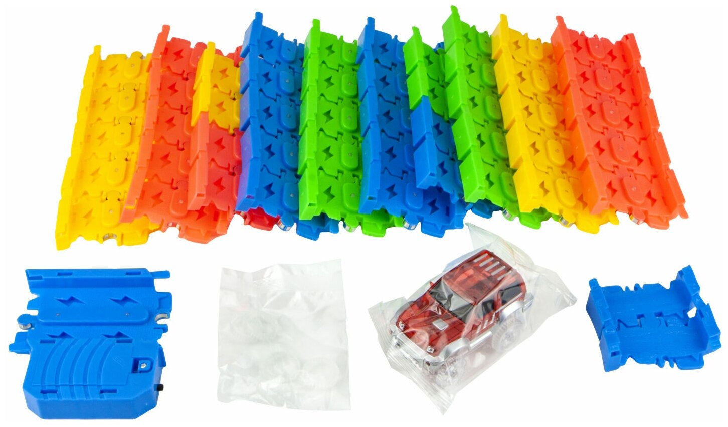 | Комплектация | 52 детали (из них 21 деталь c LED подсветкой), блок питания, машинка с 3 лампами, переходники 2 шт |