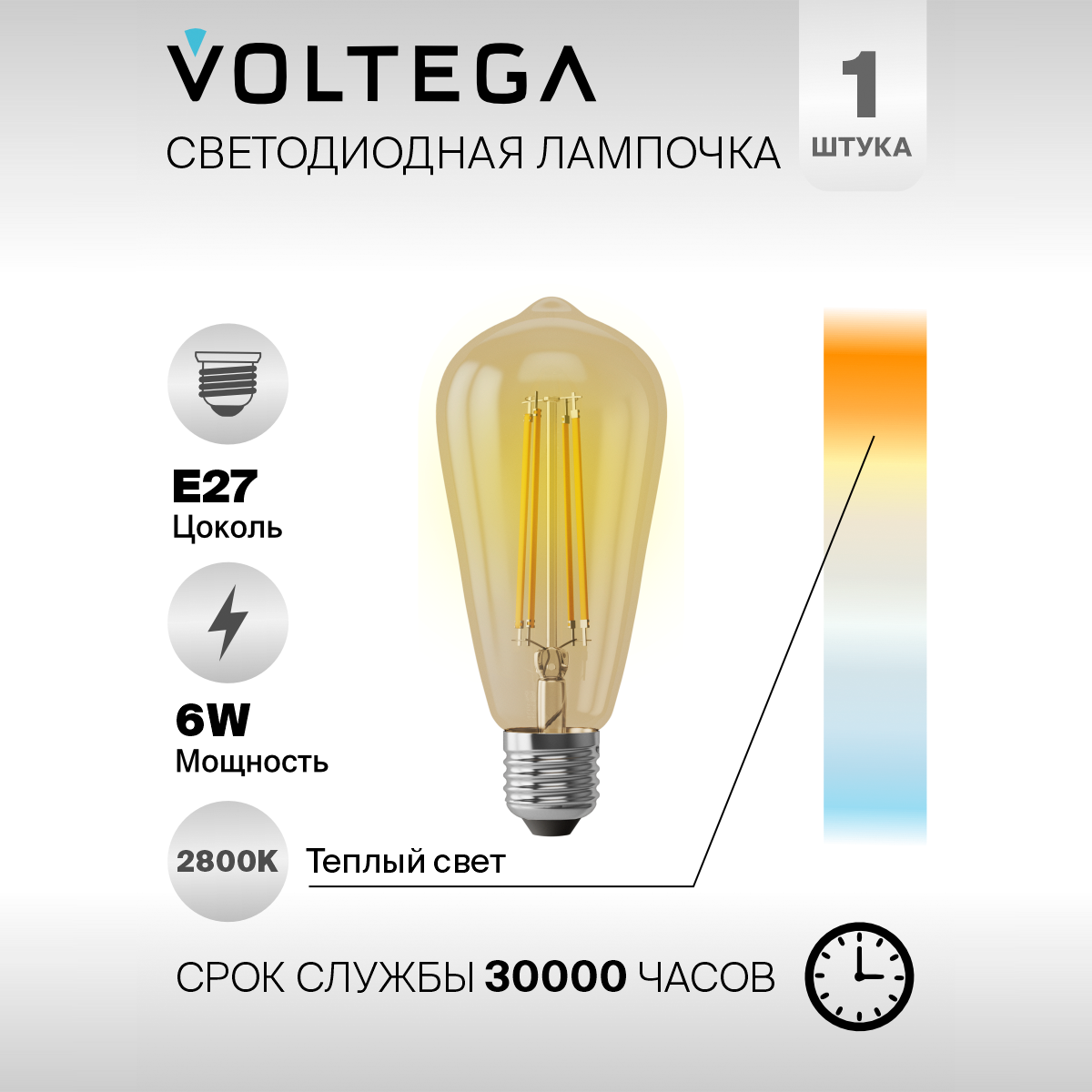 Лампа светодиодная Voltega 5526, E27, ST64, 6 Вт, 2800 К