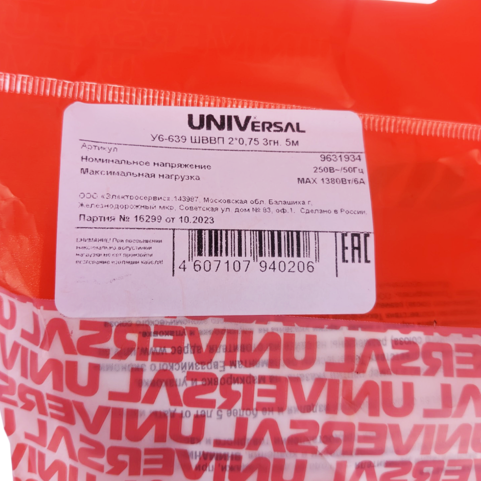 Удлинитель бытовой 3х5 м без заземления 6А У6-639 ШВВП 2х0,75 Универсал 9631934, 9631934