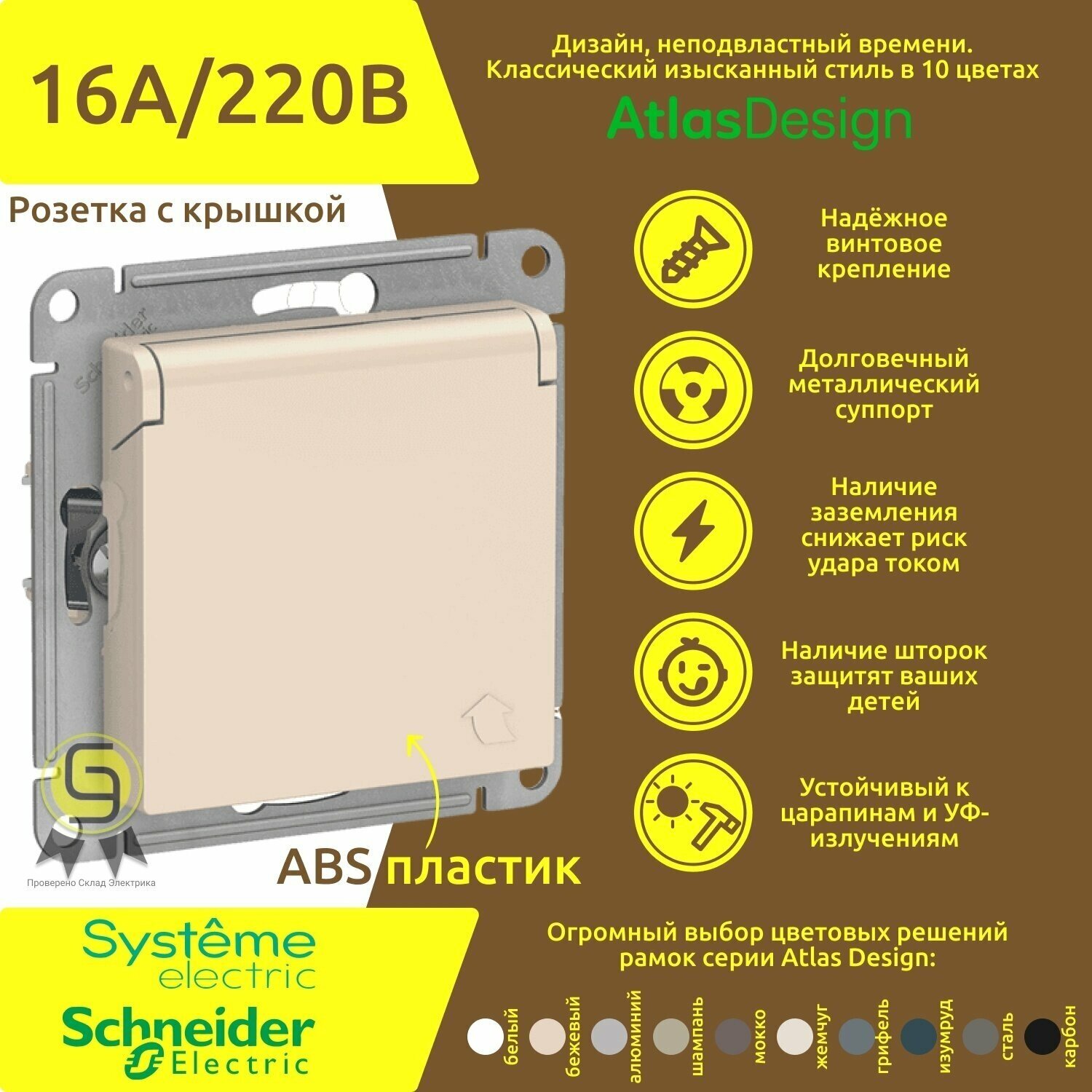 Механизм розетки Schneider Electric AtlasDesign с заземлением, с защитными шторками, с крышкой бежевая (комплект 4шт) информация: