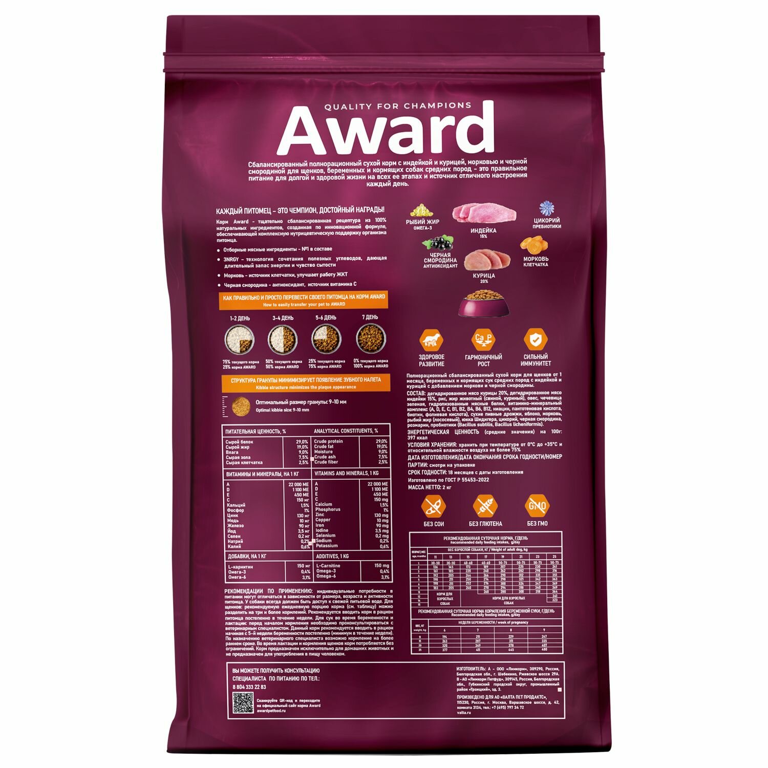 Award - Сухой корм для щенков от 1 мес, беременных и кормящих сук средних пород с индейкой и курицей с добавлением моркови и черной смородины (2кг) 1 318 ₽
