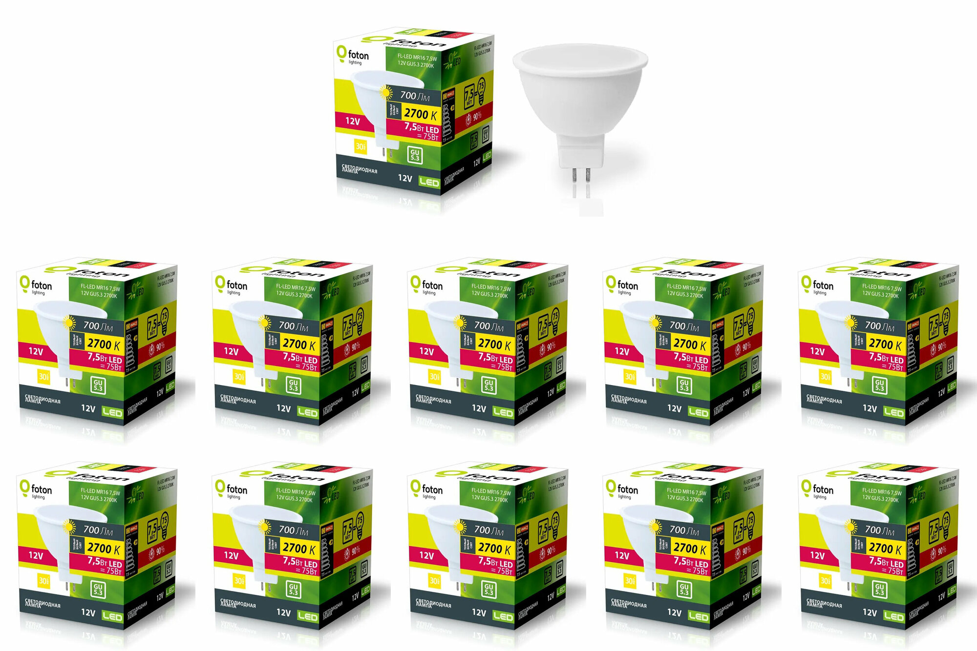 Лампочка светодиодная Foton Lighting Софит MR16 GU5.3 7,5Вт 12В 700Лм 2700К Теплый белый, упаковка 10шт