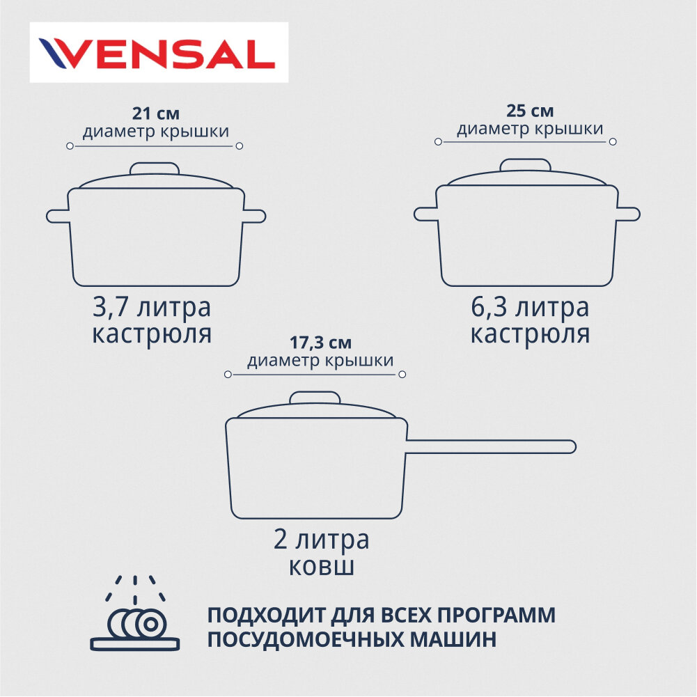 Набор 6 предметов Vensal Nouvel accord из кастрюль 3,6л(20см), 6,1л(24см) и ковша 1,9л(16см), арт. VS1520