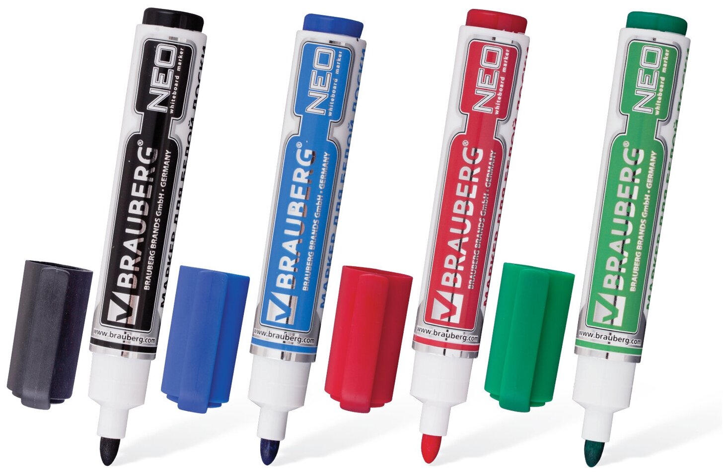 10 цен на Маркеры/фломастеры для магнитной доски стирающиеся Brauberg "Neo", набор из 4 шт., 5 мм, с клипом, ассорти, круглый наконечник