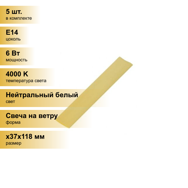 (5 шт.) Светодиодная лампочка Ecola свеча на ветру E14 6W 4000K 4K 118x37 C4YV60ELC Нейтральный белый. Цоколь E14 информация: