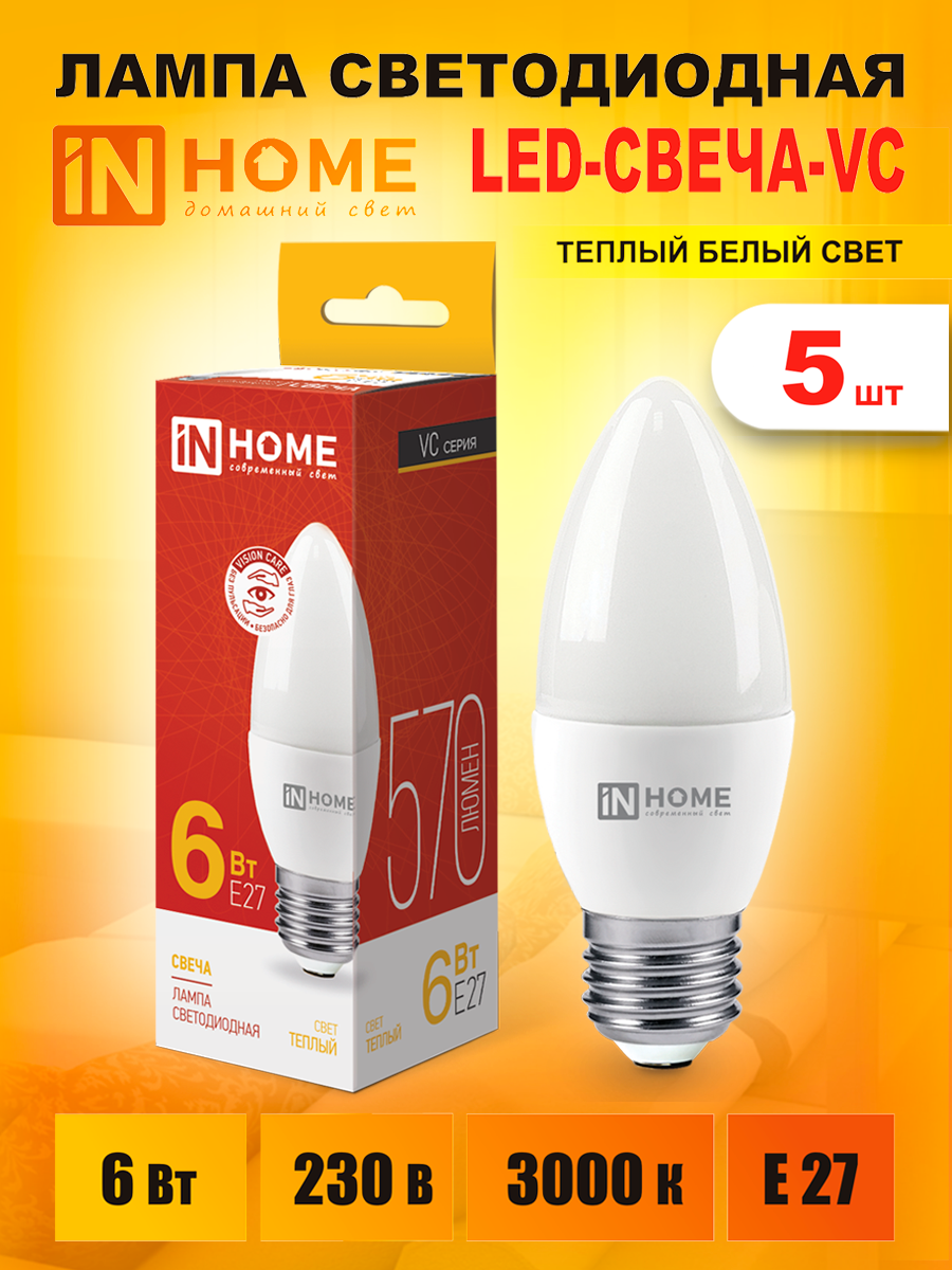Отзывы на Лампа светодиодная IN HOME LED-СВЕЧА-VC 6Вт Е27 3000К 570Лм, Теплый белый свет, 5шт.
