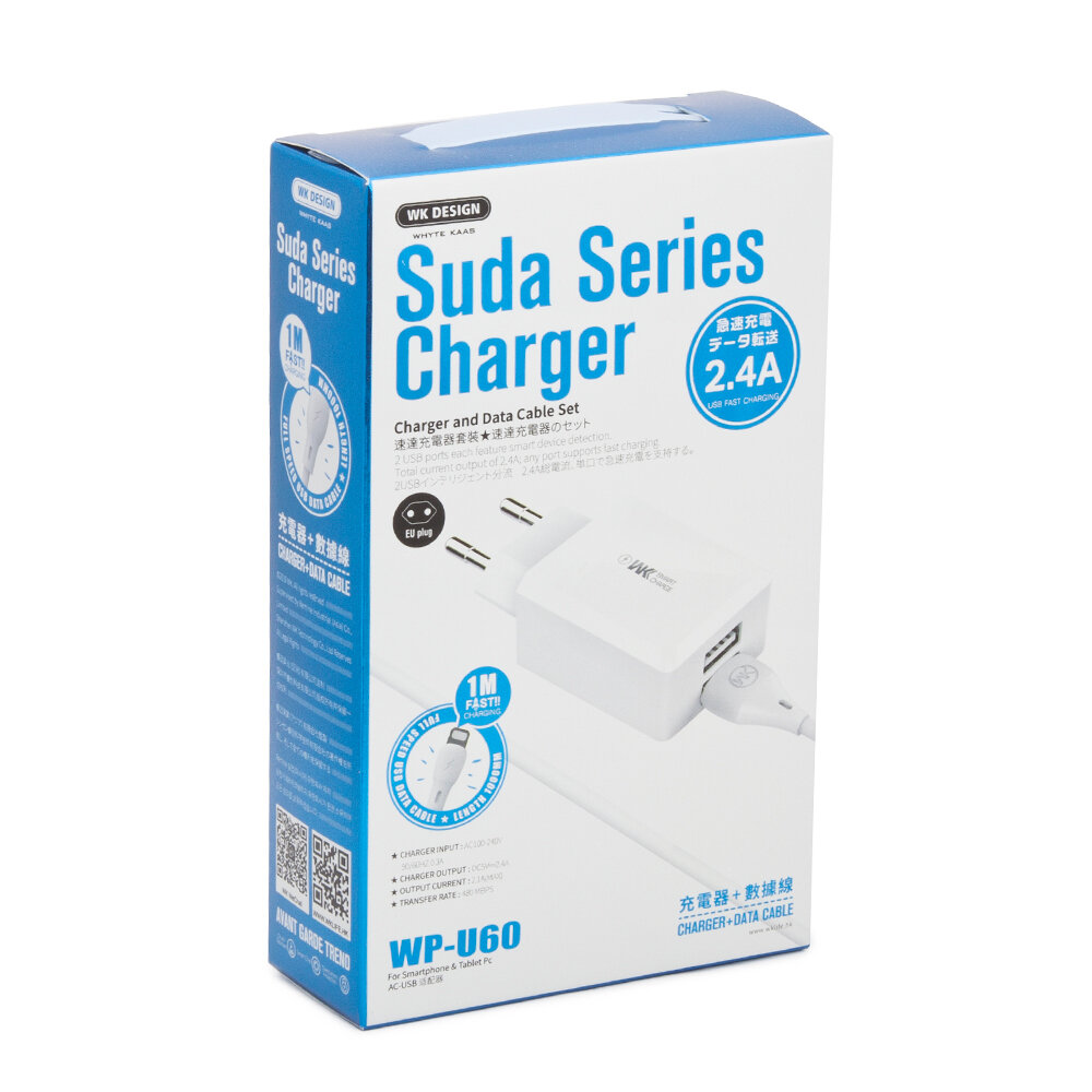 Сетевое зарядное устройство (адаптер) WK Suda WP-U60i, 2 порта USB-А, 2.4А, кабель Lightning 8-pin в комплекте, 1 метр, белый
