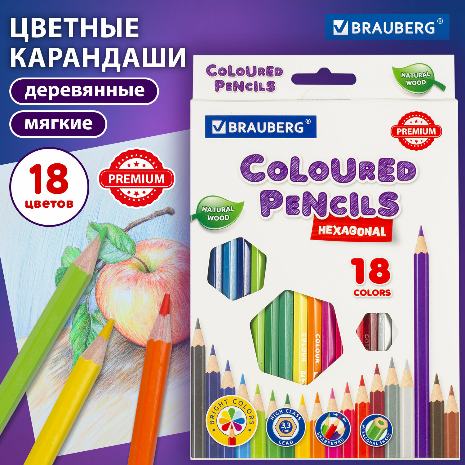 Карандаши цветные Brauberg PREMIUM, 18 цветов, шестигранные, грифель мягкий 3,3 мм