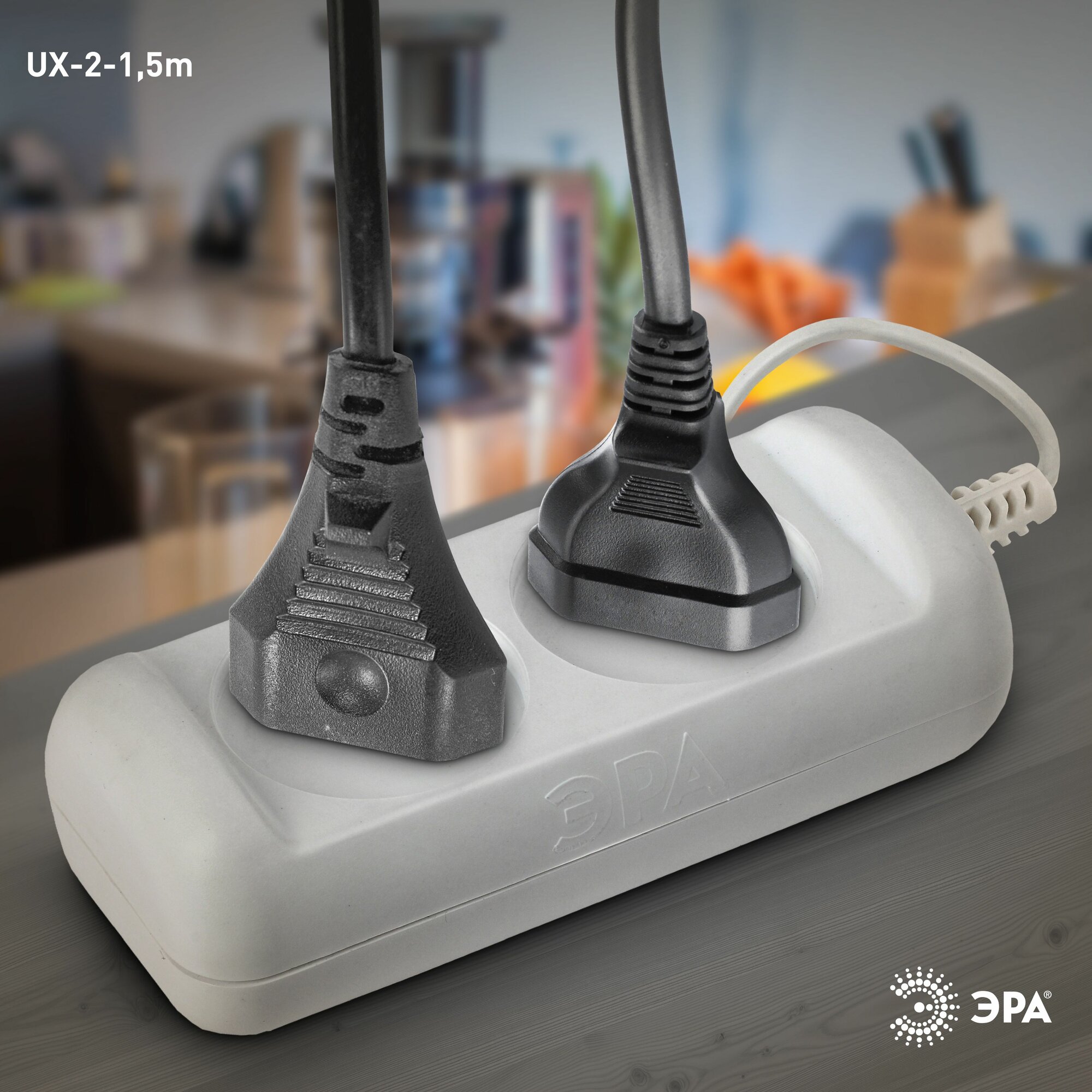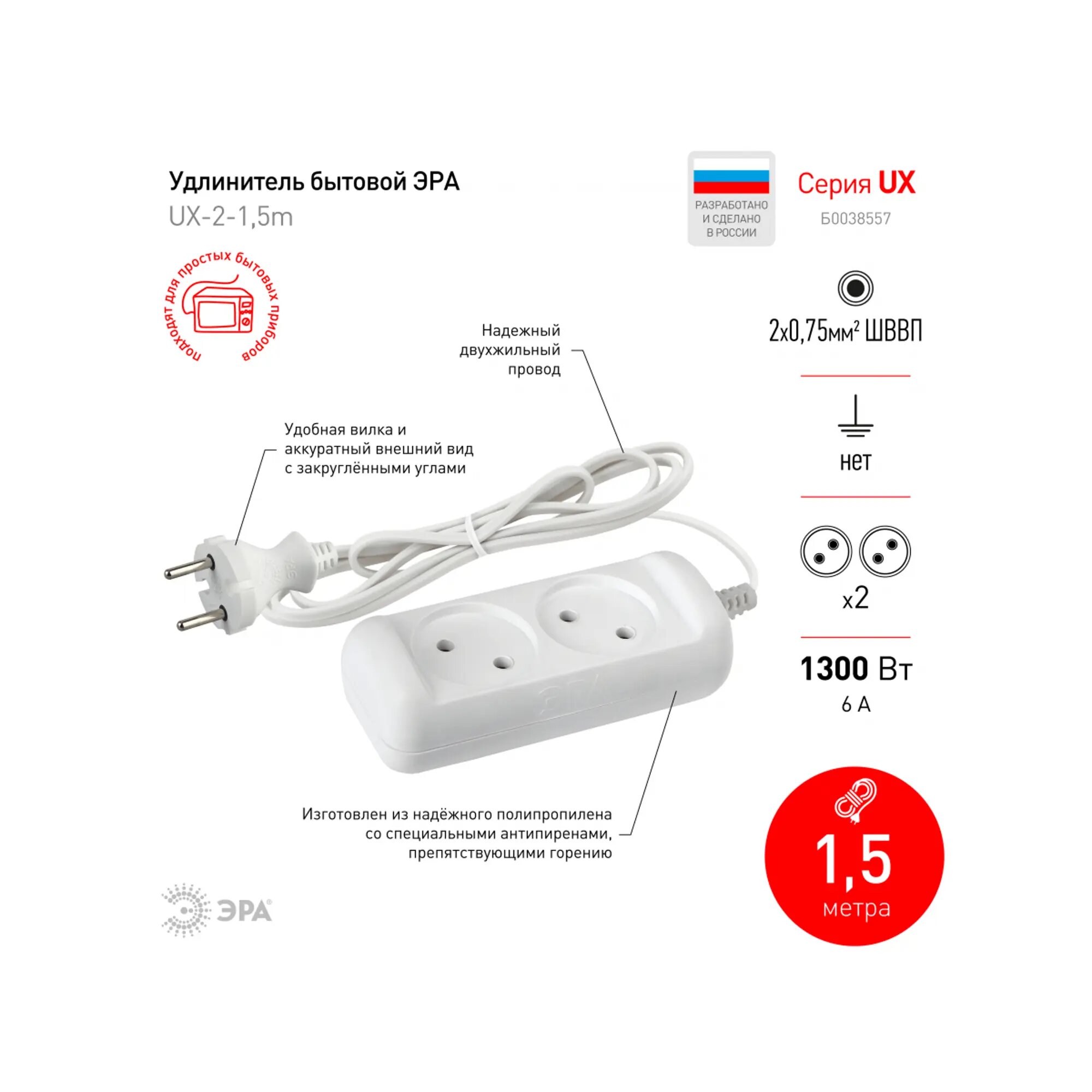 Удлинитель Россия UX-2-1,5m без заземл, 2x0.75мм2, ШВВП, 2гн, 1,5м UX-2-1,5m, ЭРА Б0038557 (1 шт.)