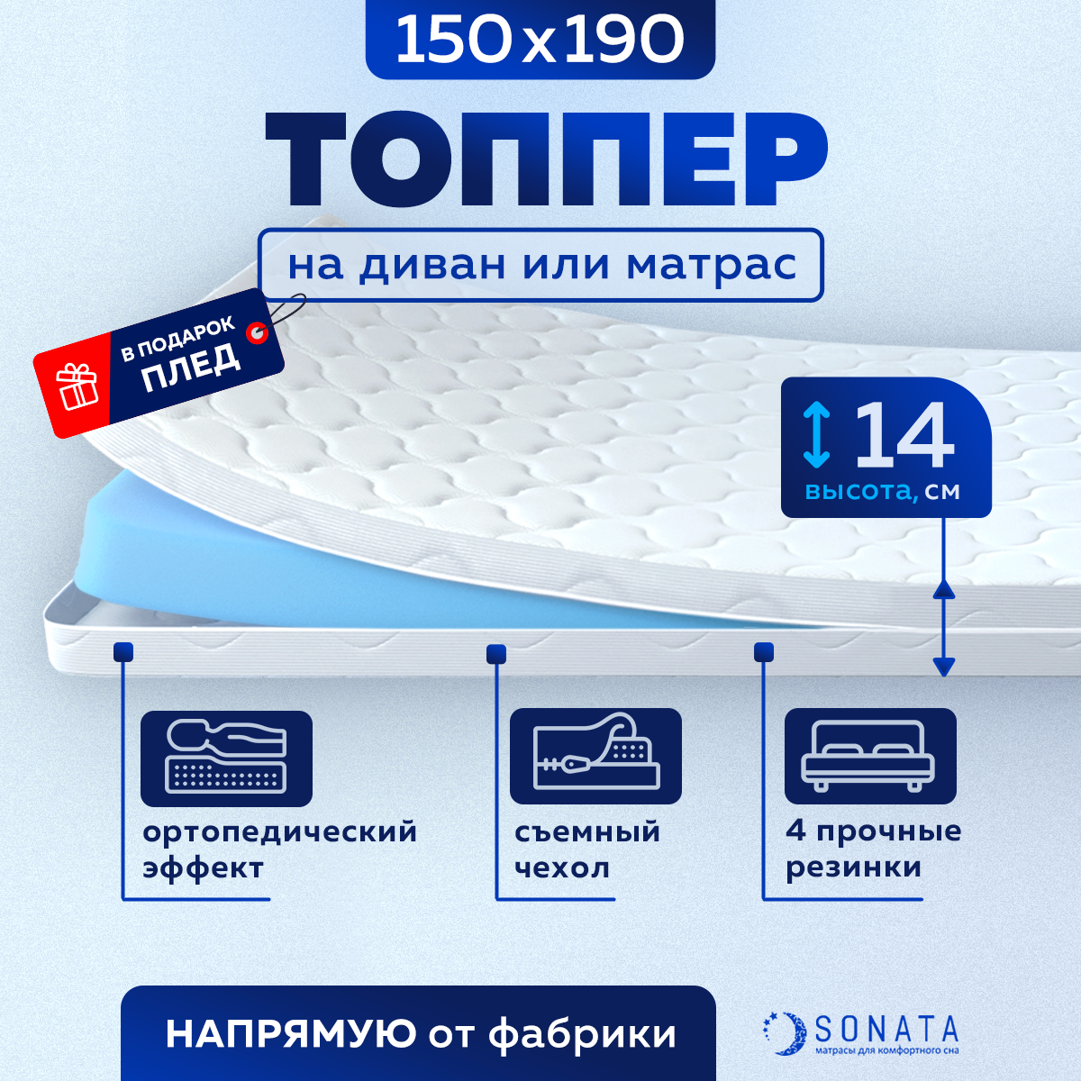 Отзывы на Матрас 150х190 см SONATA, Беспружинный, высота 14 см, Съемный чехол, Плед в подарок