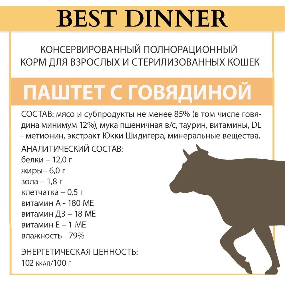 BEST DINNER Super Premium Sterilised Корм влаж.говядина паштет д/стерилизованных кошек 100г информация: