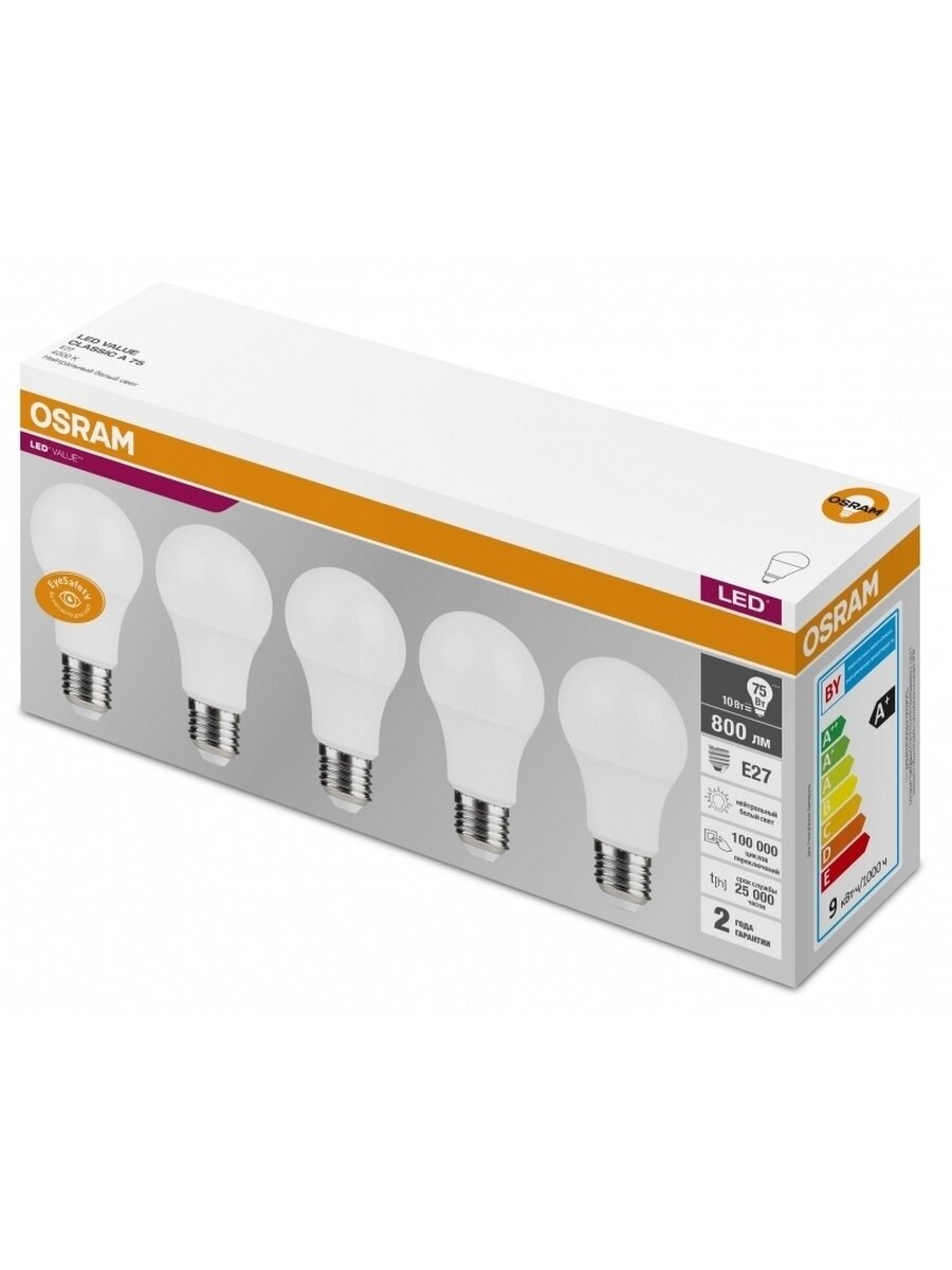 Упаковка из 5 светодиодных ламп LED Value LVCLA75 10SW/840 230В E27 RU OSRAM