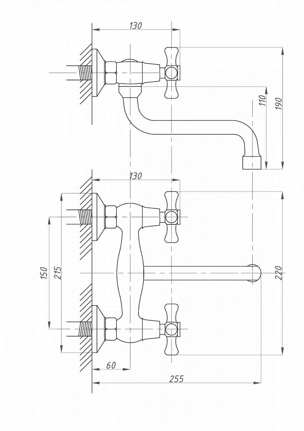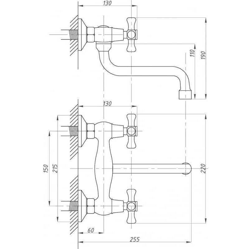 Смеситель на раковину настенный Эверест B46-350 с круглым поворотным изливом, кран-буксы 1/2", хром