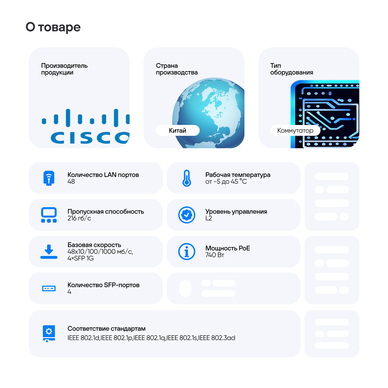 Коммутатор Cisco Catalyst 2960-X WS-C2960RX-48FPS-L 48 х GigE PoE+ 740W 4 x 1G SFP информация: