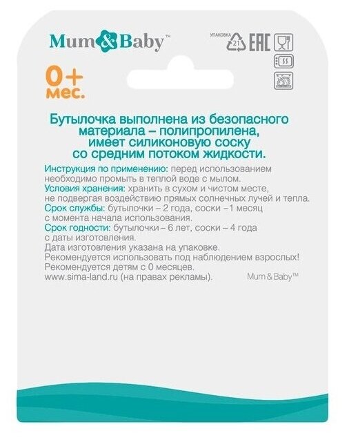 Mum&Baby Бутылочка для кормления «Наше сокровище» детская приталенная, с ручками, 250 мл, от 0 мес., цвет бирюзовый 569 ₽