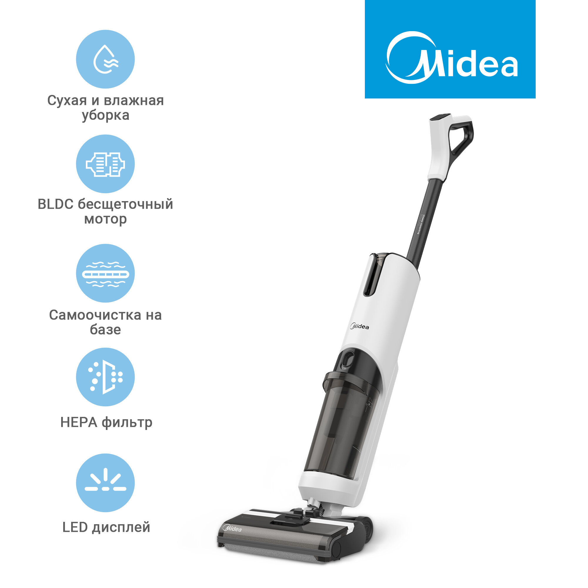 10 цен на Вертикальный моющий пылесос Midea VSS5800, сухая+влажная уборка, LED дисплей, зарядная база, HEPA фильтр, самоочистка на станции, белый/черный