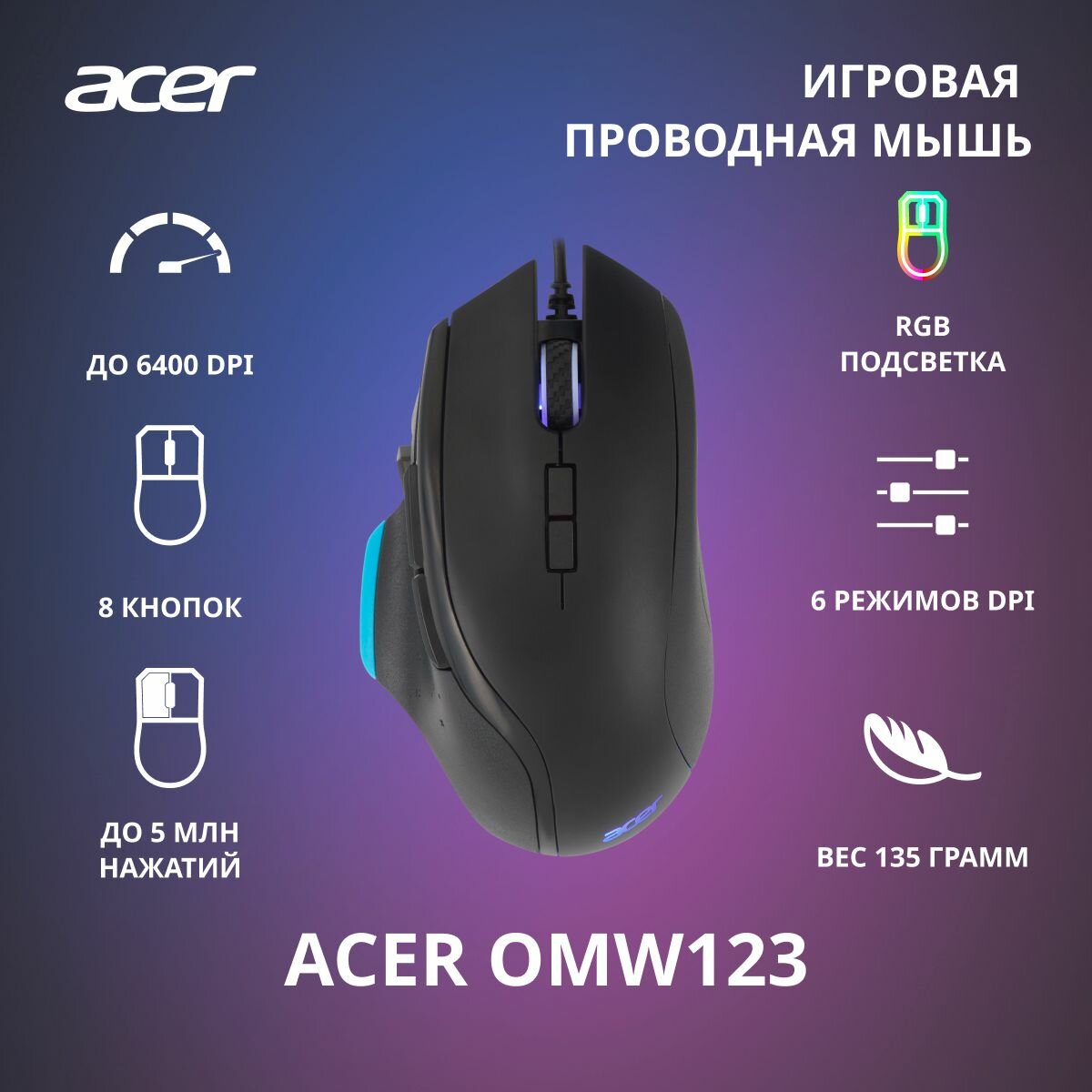 Мышь Acer OMW123, игровая, оптическая, проводная, USB, черный [zl.mceee.00x]