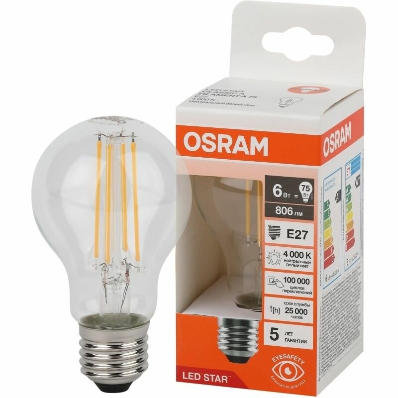 5шт/уп. Лампа LED Груша 6Вт 220-240В E27 806Лм 4000К Угол 300 град. d 60mm h 105mm Филаментная Стекло Свет Дневной белый Osram, уп. 5шт 1 914 ₽