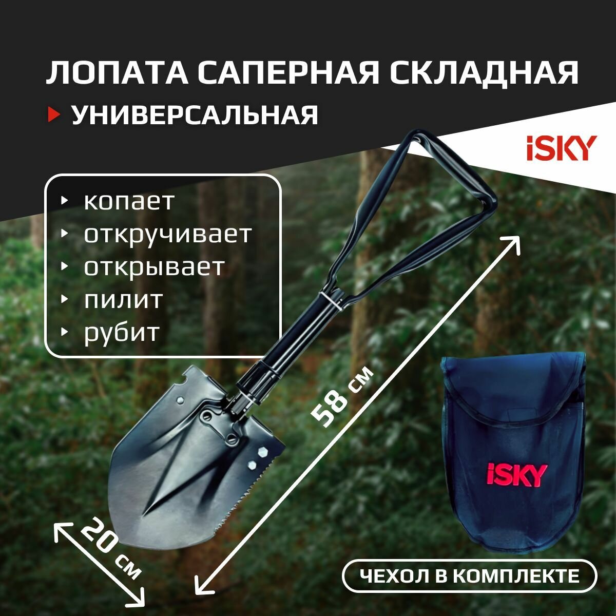 iSky Лопата саперная iSky (24-58 см), металлическая, складная, черная, в чехле