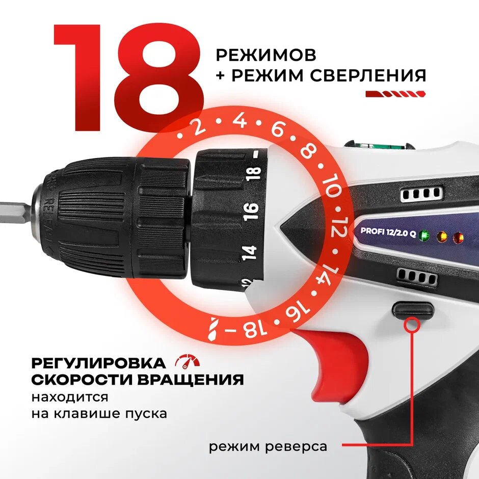 Дрель шуруповерт аккумуляторный Electrolite PROFI 12/2.0Q EL ( 12 В, 2.0 Ач, 26 Hm, Li-Ion, подсветка) информация: