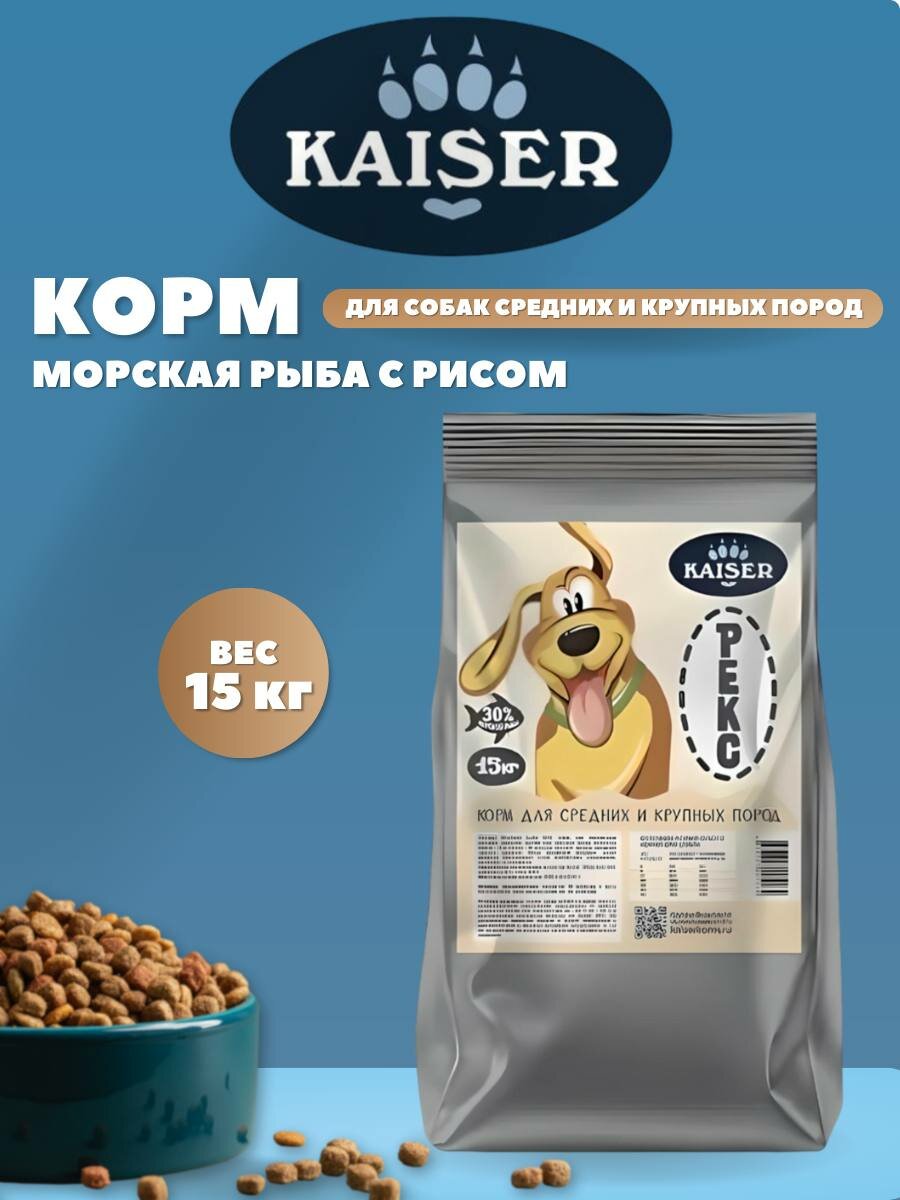10 цен на KAISER Полнорационный Сухой корм для собак средних и крупных пород REX - "Лосось ", 15 кг