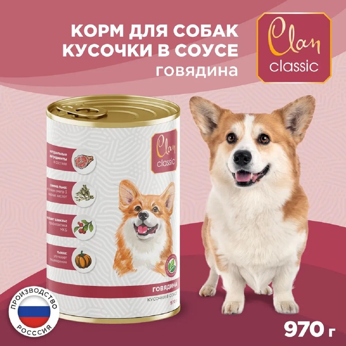 Влажный корм для собак Clan Classic, кусочки в соусе с говядиной 970 г х 1 шт