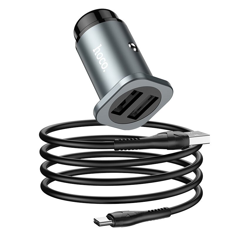 Автомобильное зарядное устройство HOCO NZ4 Wise, 2*USB + Кабель USB-Type-C, 2.4A, серый металлик