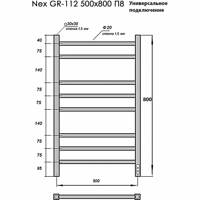 Полотенцесушитель электрический Nex GR-112 500х800 П8 white U универсальное подключение (левый/правый)