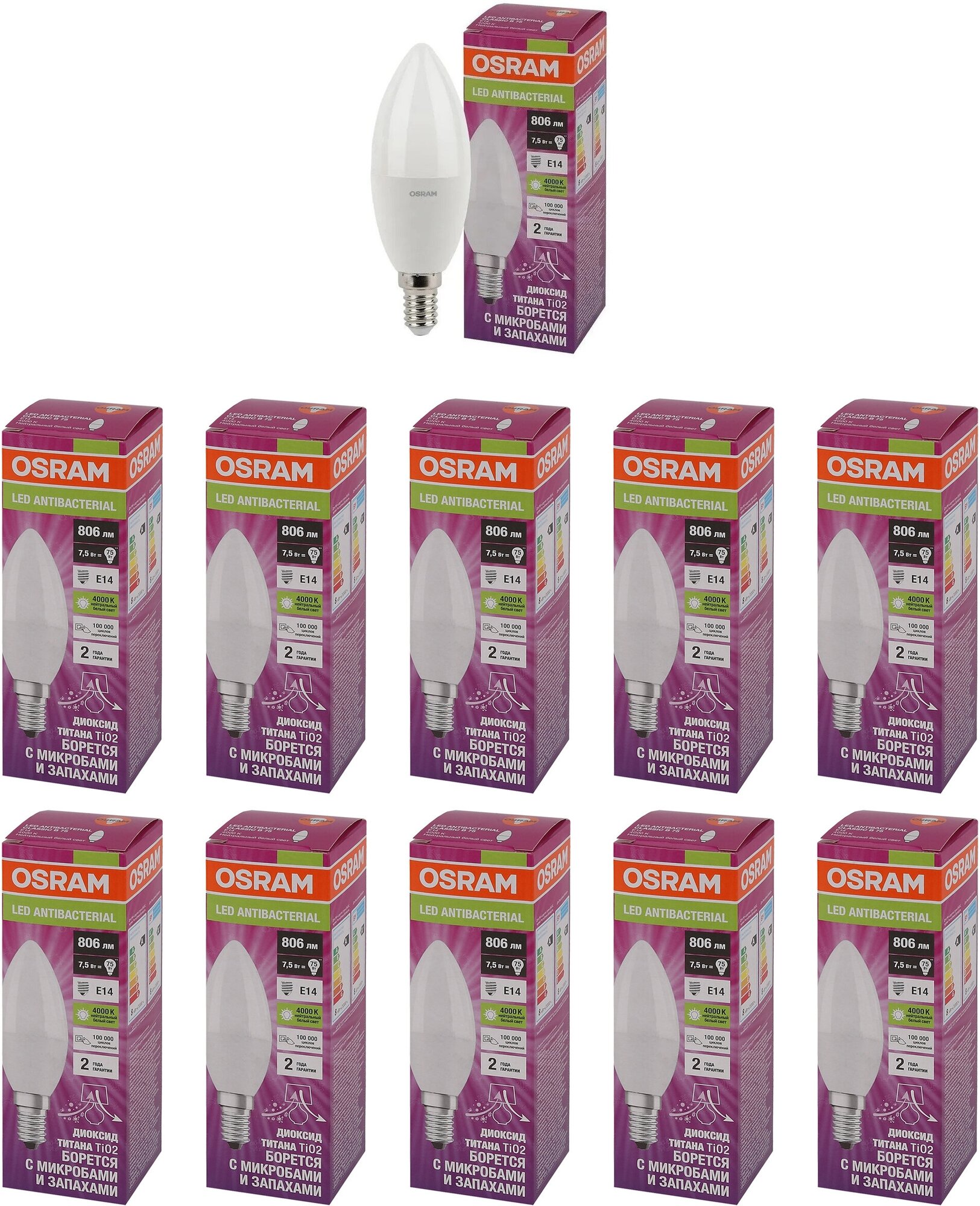 10 цен на Лампа LED Антибактериальная Свечка 7.5W 220-240V E14 806Лм 4000К Угол 220 град. D-39mm L-115mm Свет Нейтральный белый OSRAM, уп. 10шт