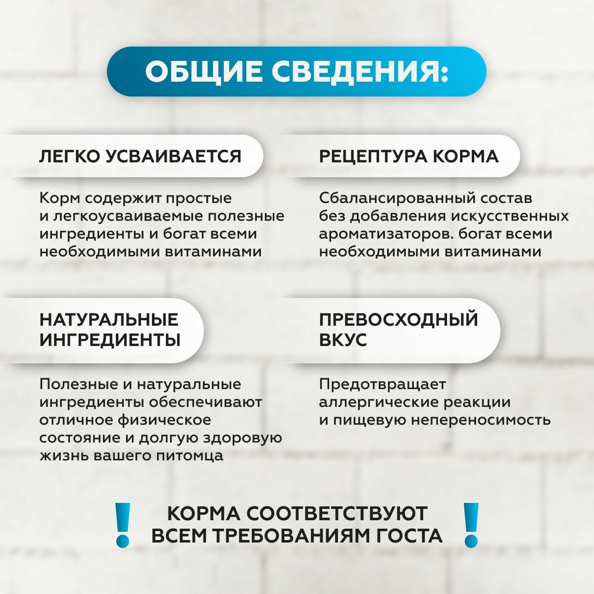 | Состав | мука мясная куриная, жир животный пищевой, рис, кукуруза, пшеница, мука рыбная, мука мясная, семена льна, рыбий жир, пульпа сахарной свеклы, печеночный экстракт, сухое цельное яйцо, соевое масло, минеральные вещества (цинк, медь, кобальт, железо, йод, калий, кальций, фосфор селен, магний), антиоксиданты, таурин, комплекс витаминов |