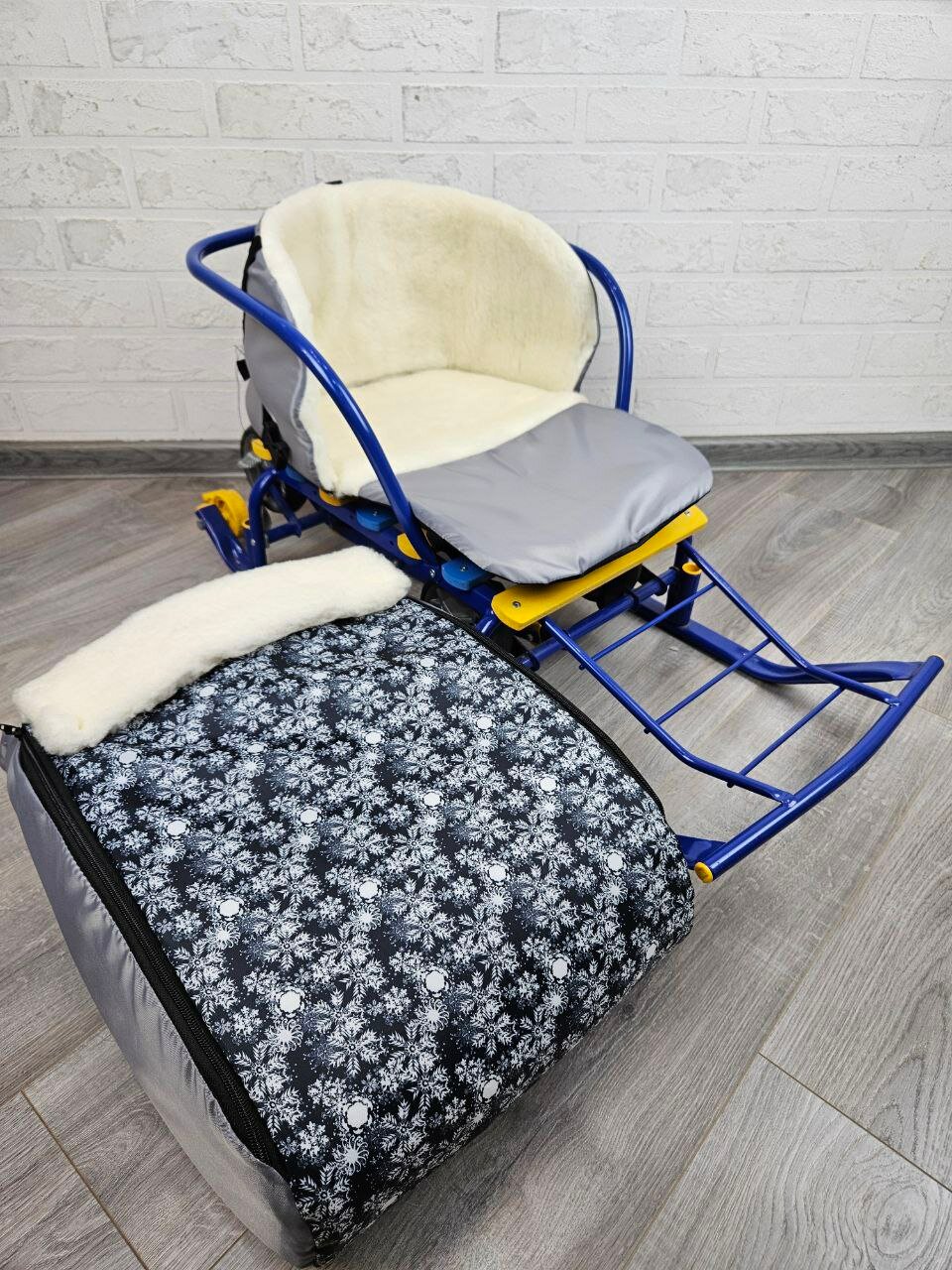 Матрасик для санок меховой 3 в 1 Снежинки на синем бок черный мех черный 1 750 ₽