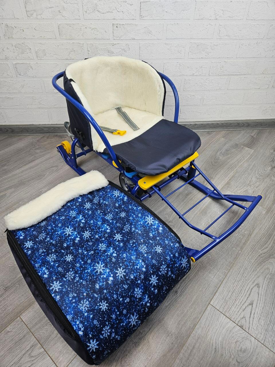 Матрасик для санок меховой 3 в 1 Снежинки на синем бок черный мех черный 1 750 ₽