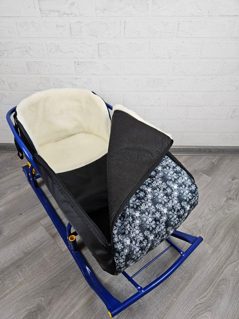 Матрасик для санок меховой 3 в 1 Снежинки на синем бок черный мех черный 1 750 ₽
