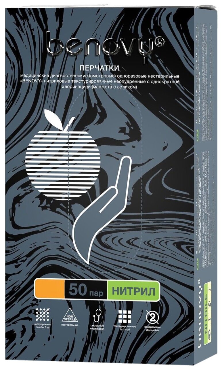 Перчатки нитриловые смотровые Benovy черные (50 пар, M)