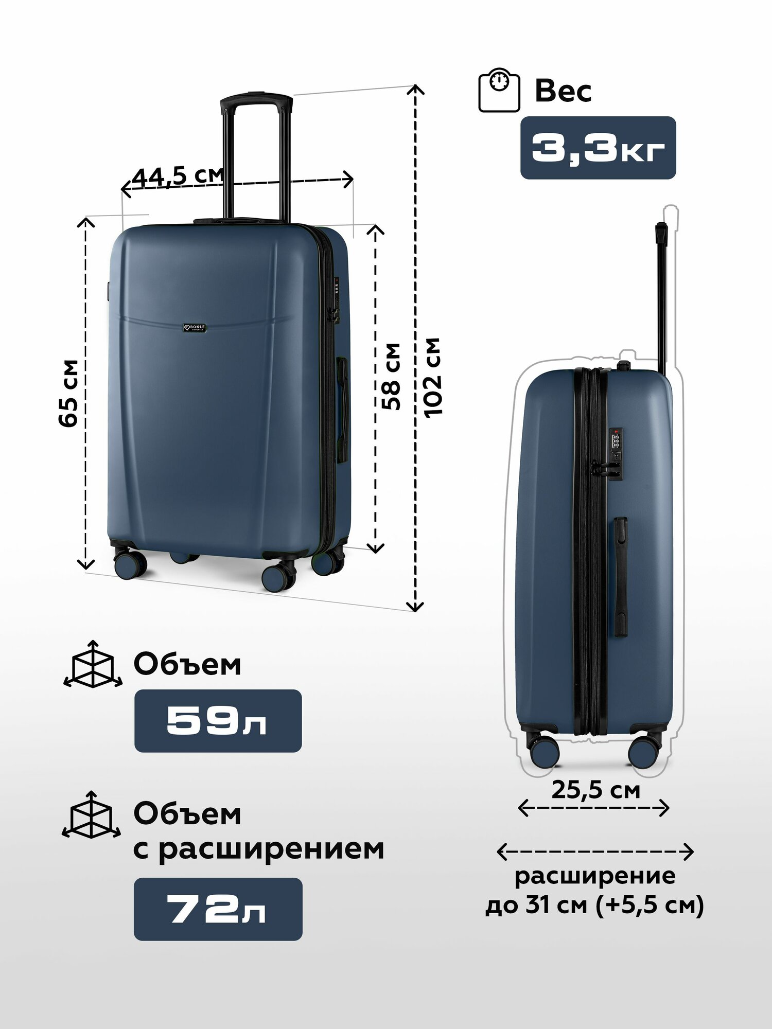 Чемодан на колесах L темно-синий Bonle, премиум ABS-пластик 75,5 см, 101 л, большой дорожный 7 980 ₽