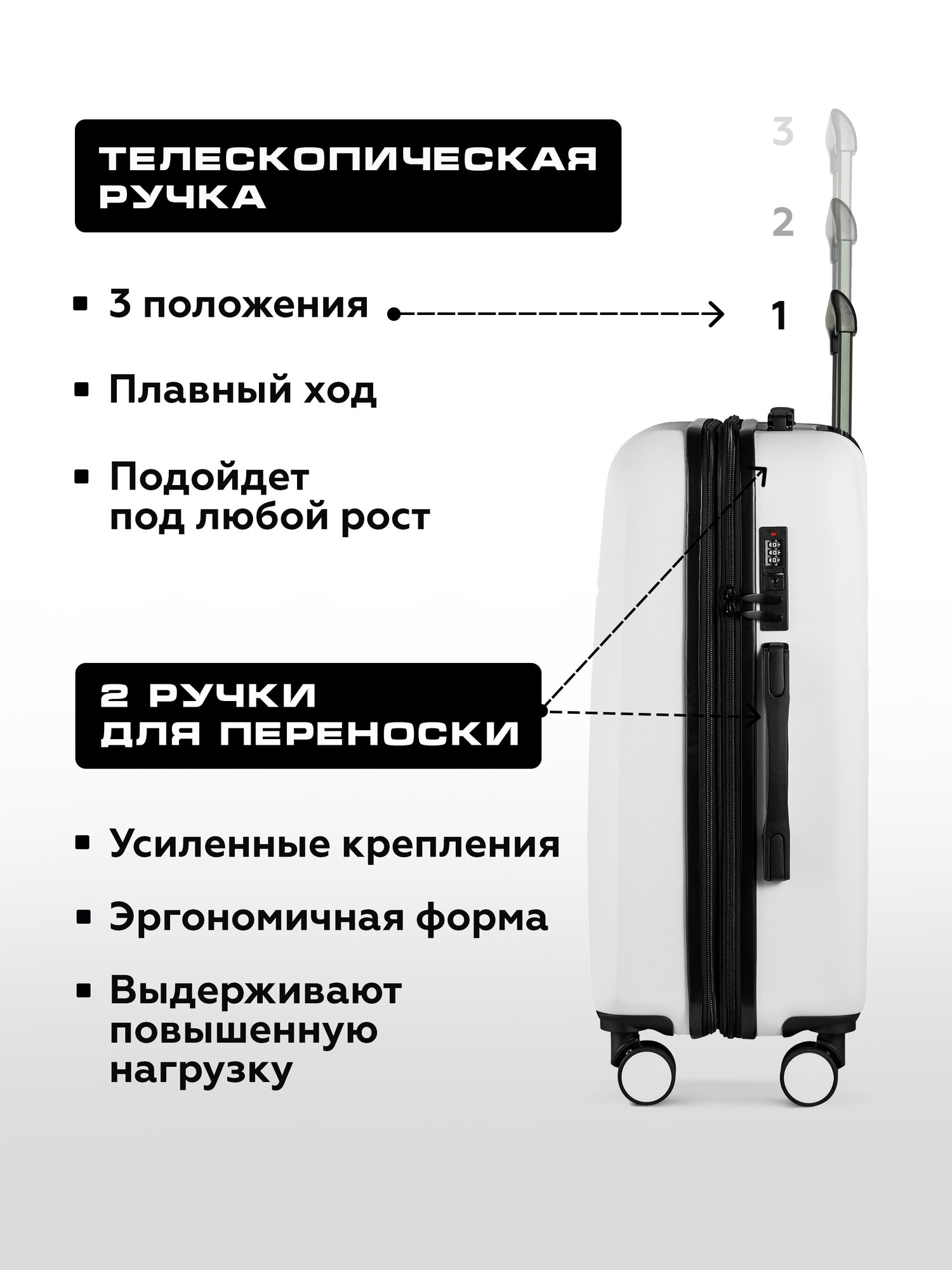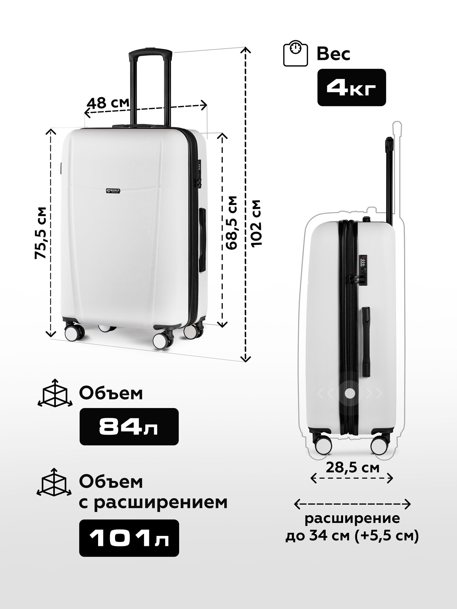 Чемодан на колесах L белый Bonle, премиум ABS-пластик 75,5 см, 101 л, большой дорожный информация: