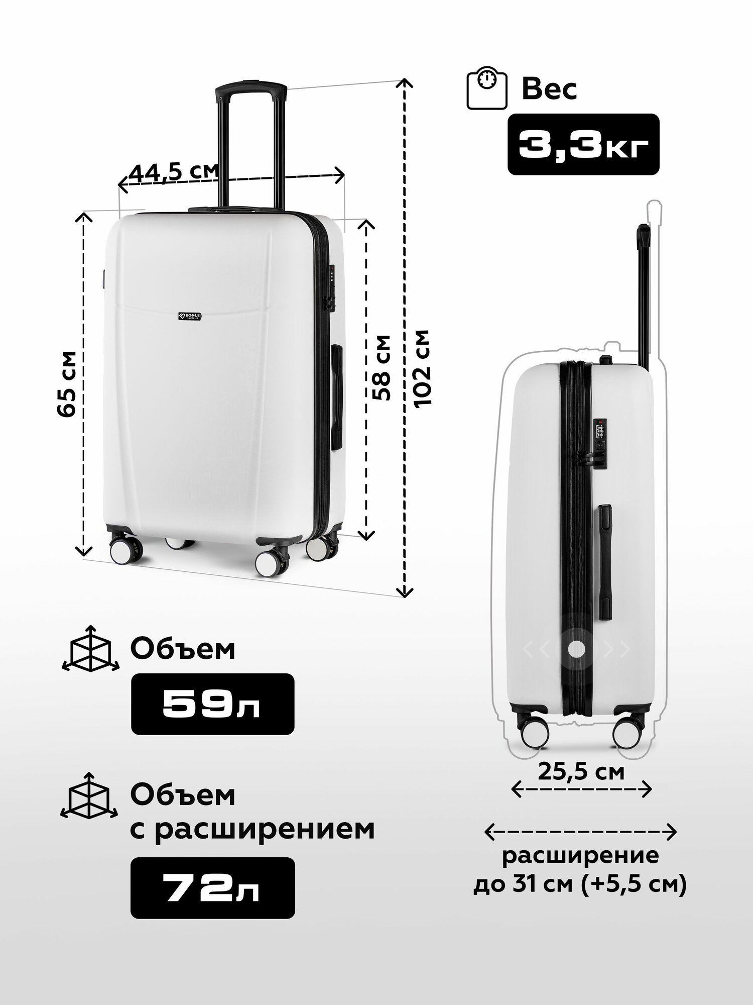 Чемодан на колесах L белый Bonle, премиум ABS-пластик 75,5 см, 101 л, большой дорожный 7 980 ₽
