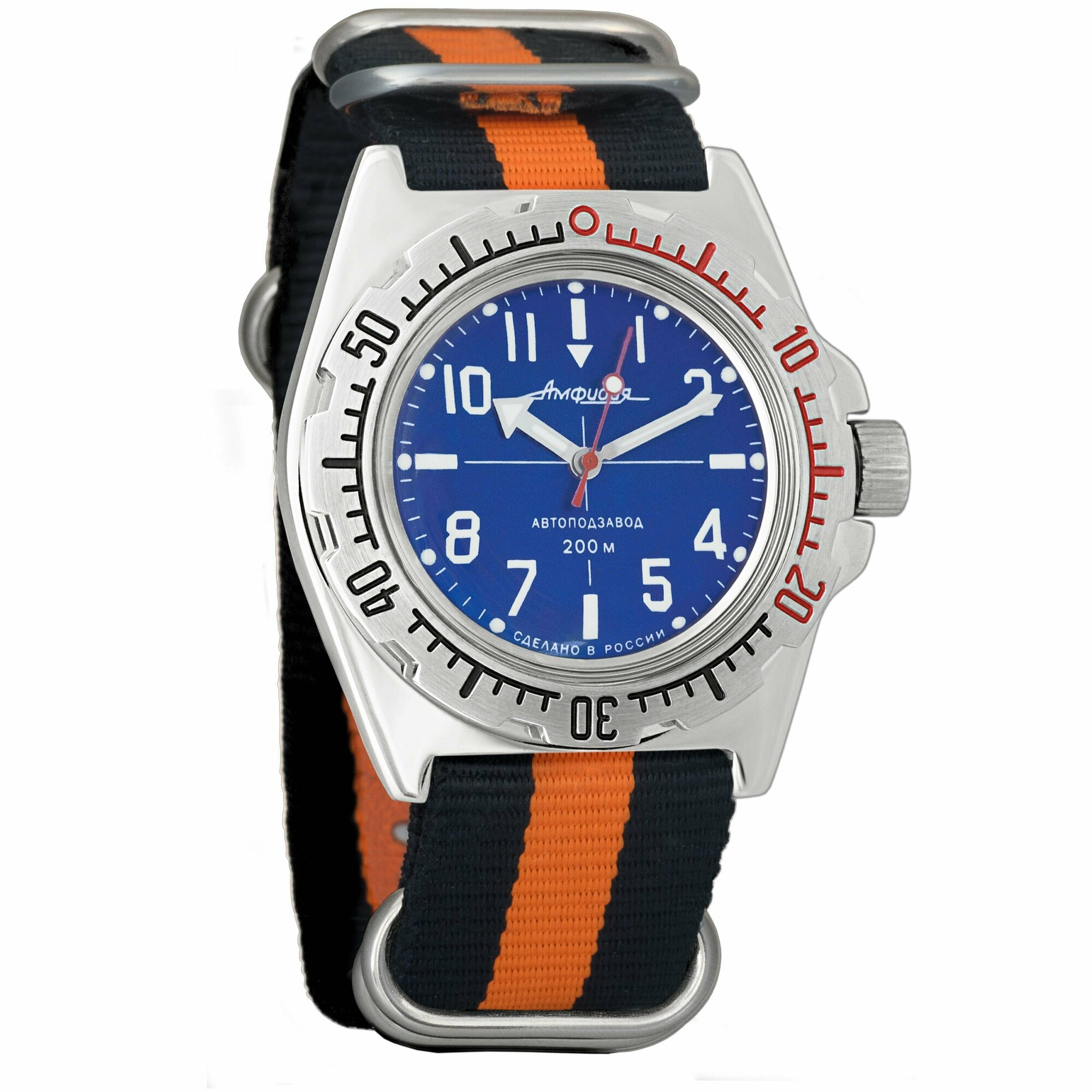 Отзывы на Часы наручные мужские механические с автоподзаводом Восток Амфибия 110648_black_orange, нейлон, оранжевый/черный