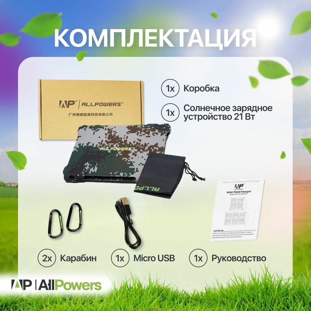 Солнечная панель Allpowers 21Вт / 5В камуфляж, складное солнечное зарядное устройство информация: