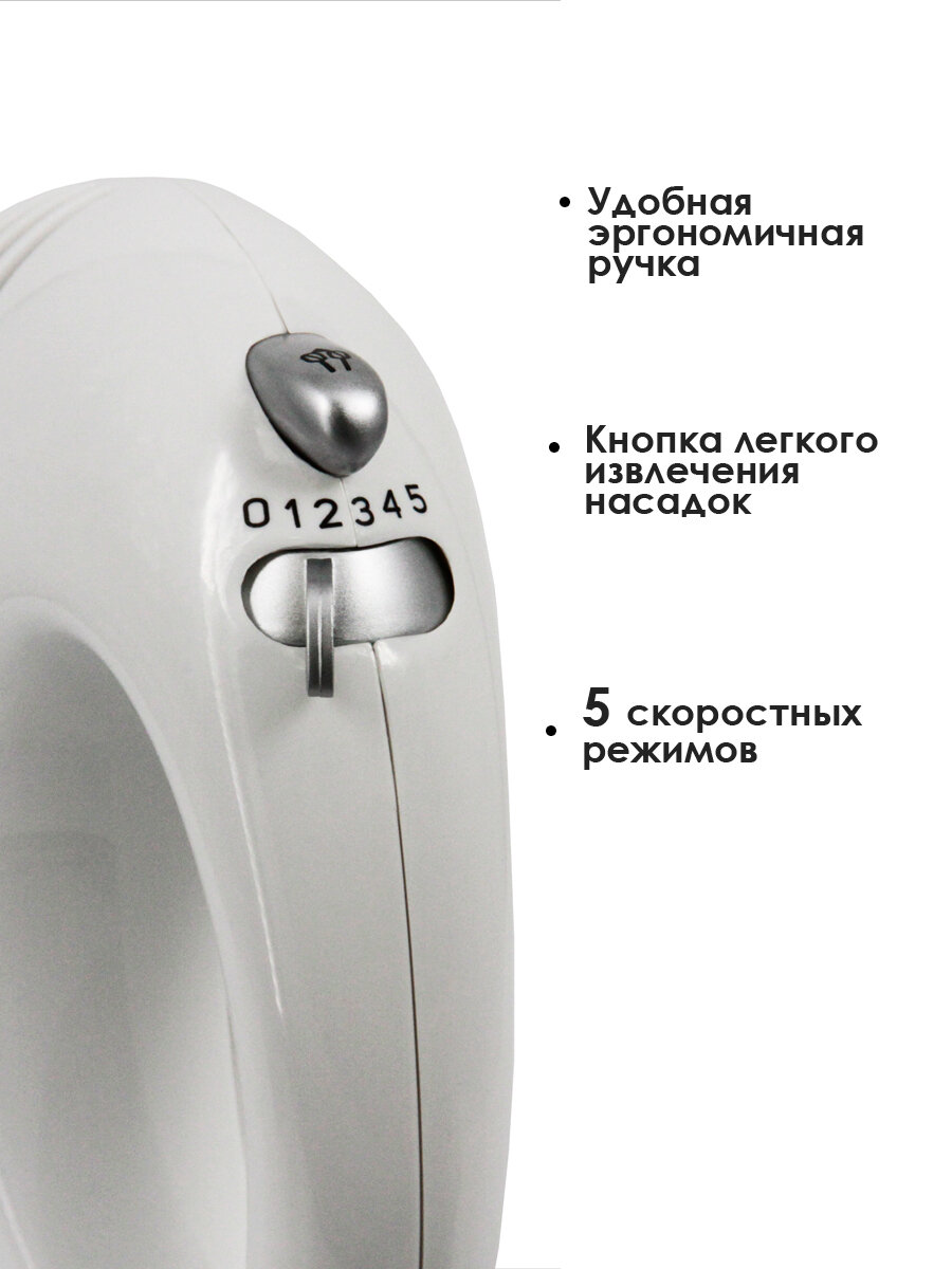 | Дополнительная информация | Кроме традиционных насадок-венчиков, в комплекте приложены винтовые насадки, позволяющие перемешивать более густые смеси, например, легкое тесто |