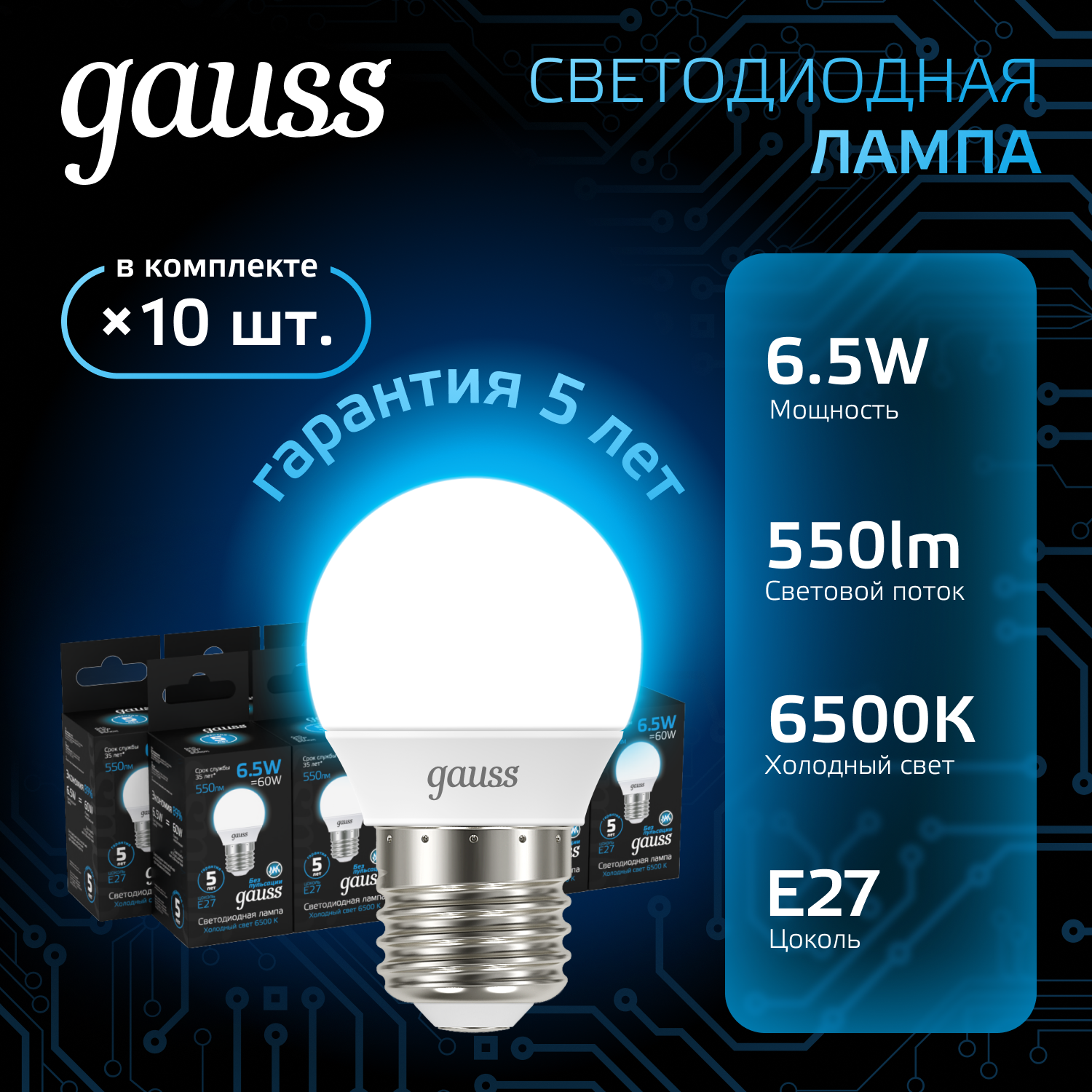 Лампочка светодиодная E27 Шар 6.5Вт холодный белый свет 6500K упаковка 10 штук Gauss