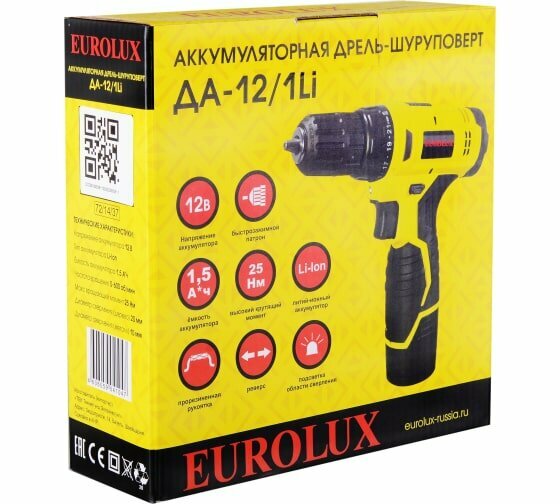 Шуруповерт - дрель аккумуляторная ДА-12/1Li Eurolux быстрозажимной, 600 об/мин, 25/13 Нм, 12В, 1,5 А*ч) информация: