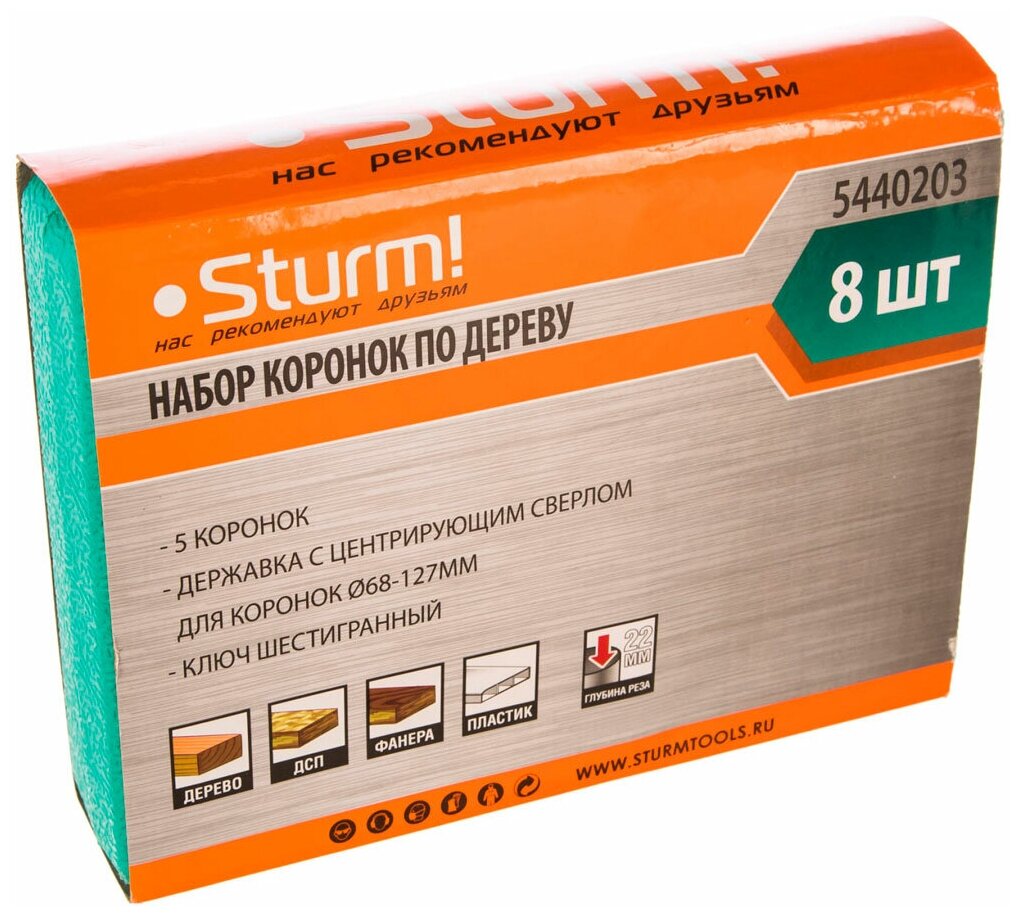 Коронки по дереву Sturm! набор 5440203 8 предметов d=68/76/89/102/127мм, кейс информация: