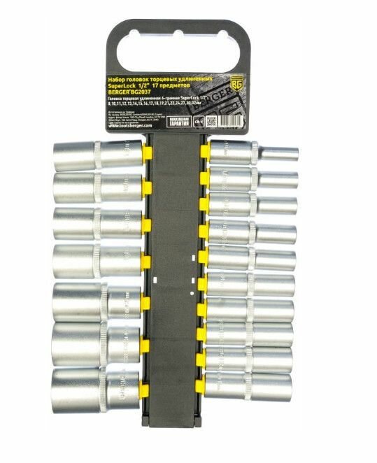 Набор головок торцевых удлиненных BERGER BG2037 1/2" SuperLock 17 предметов (8-32мм) подвес информация: