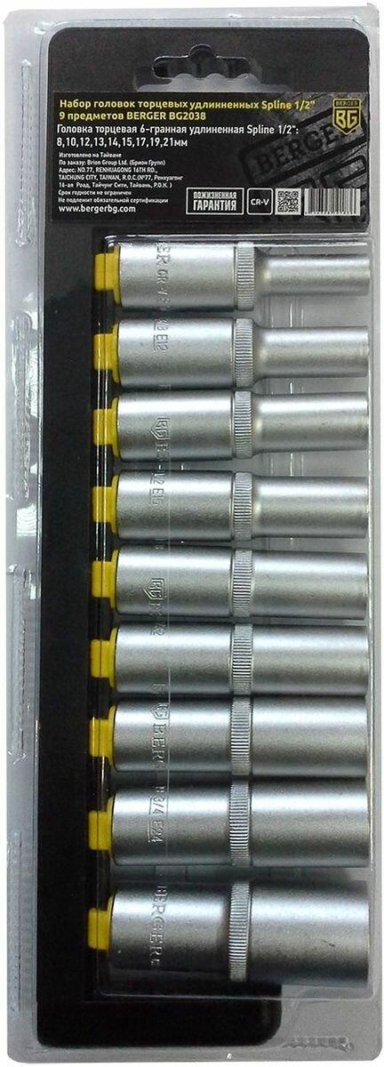 Набор головок торцевых удлиненных BERGER BG2038 1/2" Spline 9 предметов (8-21мм) подвес